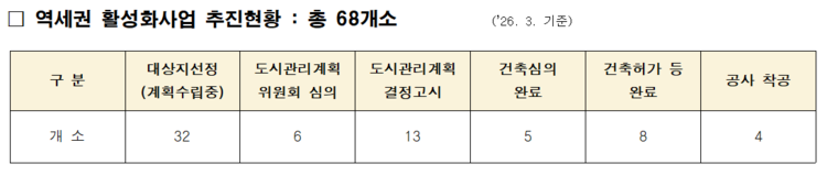 그러나 서울시 추진 현황(2026년 3월 기준)에 따르면 총 68개소 중 실제 착공에 이른 곳은 4곳에 불과하다. 나머지 64곳은 대상지 선정, 위원회 심의, 고시 등 행정 절차 단계에 머물러 있다.