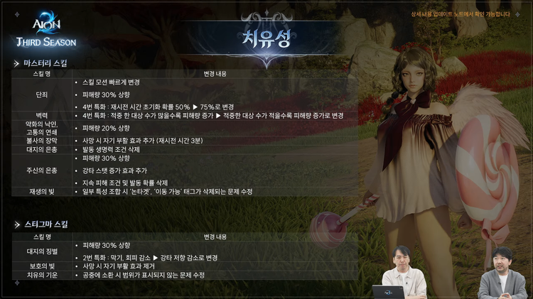 방송에서는 첫 번째 밸런스 개선 대상으로 '치유성'이 언급됐다. 치유성은 현재 파티 플레이에서 힐과 딜을 동시에 수행해야 해 손이 매우 바쁜 반면, 공격력이 낮아 던전 클리어 타임이 지연되는 고질적인 문제를 겪고 있었다.