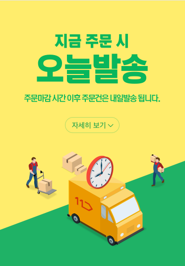 각 상품별로 당일 발송이 가능한 주문 제한시간을 표시하고 있어 당일 발송 마감되었거나 주문 당일이 휴일일 경우에는 발송 시작일을 다음날이나 평일 발송날짜로 안내한다.