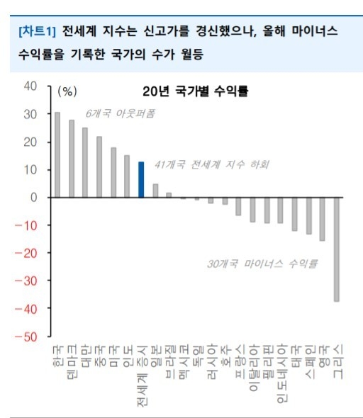 민병규 유안타증권 연구원은 "올해 전 세계 47개국 중 플러스 수익률을 기록한 국가는 17개국이다"라며 "이중 MSCI 전세계 지수의 수익률을 상회하는 국가는 한국, 덴마크, 대만, 중국, 미국, 인도 6개국 뿐으로 한국은 전세계 47개국 중 수익률 1위를 기록했다"고 밝혔다.