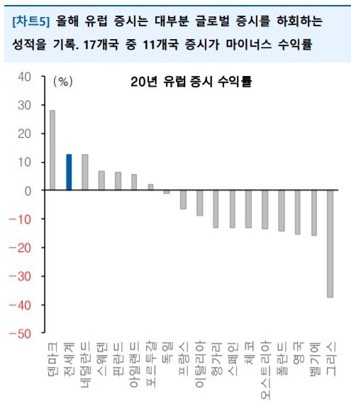 다만 증시 상승장은 일부 국가에만 한정된 것으로 나타났다. 유럽 증시는 상대적으로 부진한 성적을 거뒀다. 민 연구원은 MSCI 전세계 지수에 포함되는 17개 유럽 국가 중 11개국이 올해 마이너스 수익률을 기록했고 핵심 경제국인 독일 증시(-0.9%, MSCI 기준)도 연초대비 하락세를 보였다고 설명했다.