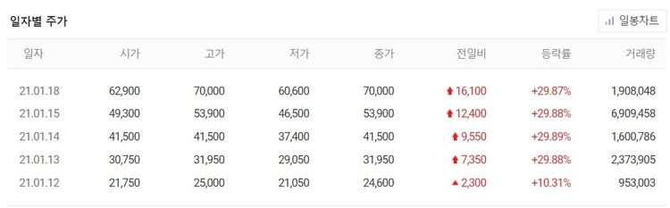 코스닥 상장사 한국파마는 18일 오전 11시 23분 전 거래일보다 29.87%(1만6100원) 상승한 7만원에 거래 중이다. 지난 13일 첫 상한가를 기록한 데 이어 4거래일 연속 상한가다.