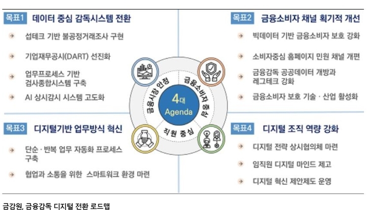 데이터 중심 감독시스템 전환과 금융 소비자 채널 개선, 디지털 기반 업무 방식 혁신, 디지털 조직 역량 강화 등이 디지털 전환의 4대 목표다. 금감원은 먼저 빅데이터·인공지능(AI) 기술을 적극적으로 활용해 불공정 거래 조사시스템, 검사 종합 정보시스템 등을 개편하기로 했다.
