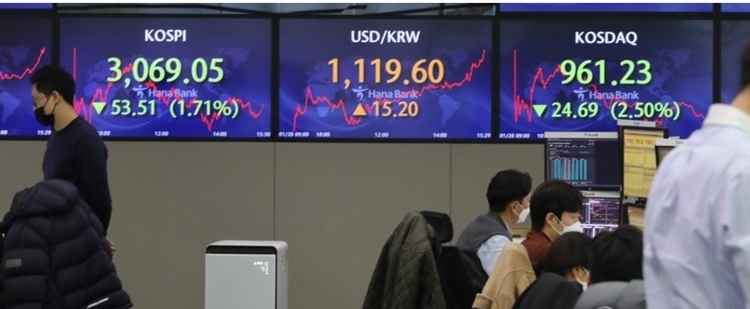 코스피가 28일 큰 폭의 하락세를 나타냄. 미국 연방준비제도(Fed·연준)발 충격에 2조원에 육박한 개인 순매수도 빛을 바랬음. 기관과 외국인은 3일째 순매도를 지속.