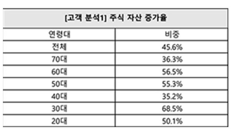 주식자산 증가는 주가 상승에 따른 수익률 상승과 투자 금액 증가에 따른 것이다. 이들 고액 자산가 전 연령대의 주식자산이 늘어난 가운데 2019년 말 대비 지난해 말 30대의 증가율(68.5%)이 가장 높았다. 60대(56.5%), 50대(55.3%), 20대(50.1%)도 50% 이상 증가했다.