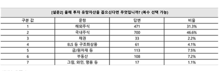 삼성증권이 지난달 11일부터 22일까지 이들을 대상으로 설문 조사한 결과, 설문에 응한 863명 중 700명(46.6%, 복수 선택 가능)은 국내 주식을 올해 유망자산으로 선택했다. 471명(31.3%)은 해외주식을 꼽았다. 금·원자재(113명, 7.5%)가 뒤를 이었고, 부동산은 108명(7.2%)에 불과했다.