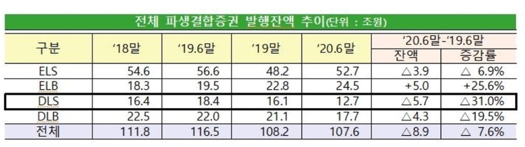10일 금융감독원에 따르면 지난해 6월 말 DLS 시장 규모는 12조7천억원으로 전년 말(16조1천억원) 대비 31% 감소했다. DLS는 주가연계증권(ELS)의 기초자산인 주식·주가지수 이외에 신용, 펀드, 금리 등 다양한 자산을 기초로 발행하는 원금 비보장형 파생결합증권을 뜻한다.