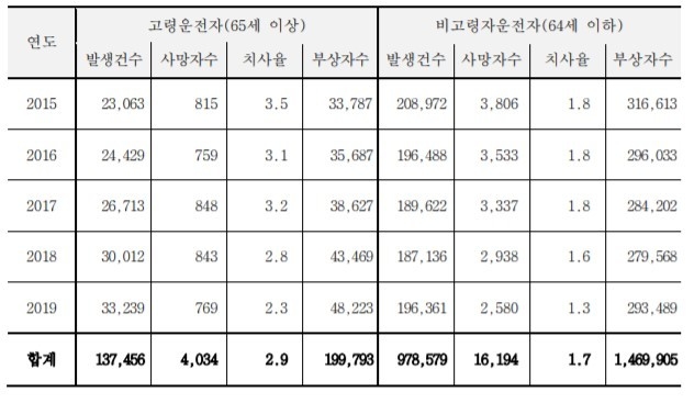 이 기간 비고령 운전자 교통사고 100건당 사망자 수, 즉 치사율은 1.7명인 데 비해 고령 운전자 교통사고 치사율은 2.9명으로 약 80% 더 높았다.