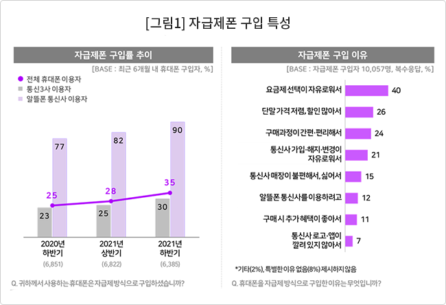 조사 대상 응답자 가운데 자급제 단말기를 선택한 비중은 35%. 요금제 선택이 자유로워서(40%)와 단말 가격이 저렴하고 할인이 많아서(26%)가 주된 이유. 구매과정이 간편해서(24%)와 통신사 가입·해지·변경이 자유로워서(21%) 등 편의성 측면의 장점이 뒤를 이어.