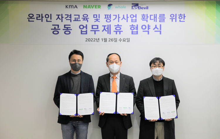 3사는 기술교류와 정보공유를 통해 온라인 교육·평가 체계를 고도화해 가기로 약속했다. 먼저, KMA가 주관하는 자격시험에서 네이버 웨일북, 엔에스데블의 솔루션을 활용하고, KMA는 운영 노하우를 바탕으로 피드백을 진행해 평가모델을 발전시켜 가기로 했다.