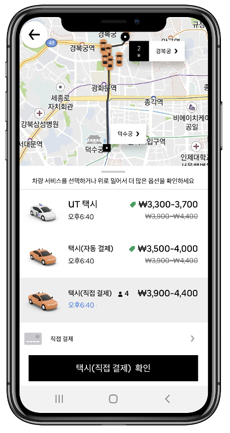 직접 결제 기능은 현장에서 현금 또는 신용카드로 택시 기사에게 직접 결제할 수 있는 서비스로 UT 앱에서 중개 택시 서비스 이용 시 사용이 가능하다.