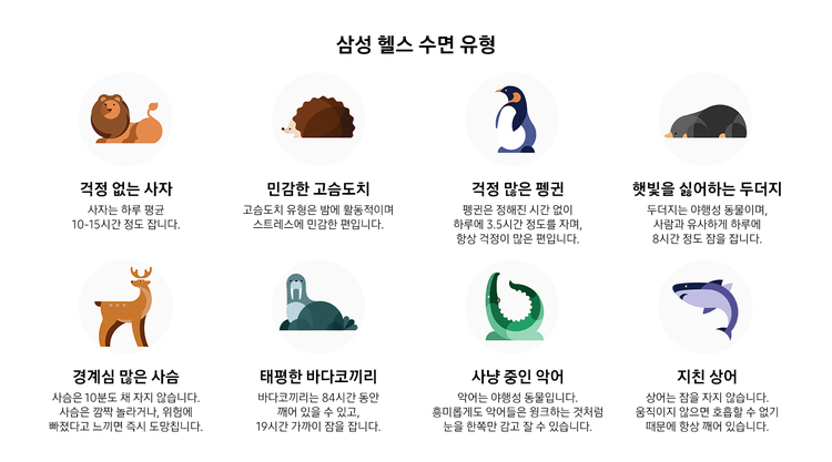 이 프로그램은 7일 이상의 수면 패턴과 2개의 질문 답변을 종합해 사용자의 수면 유형을 사자, 펭귄, 악어 등 8가지 동물 유형으로 보여준다.