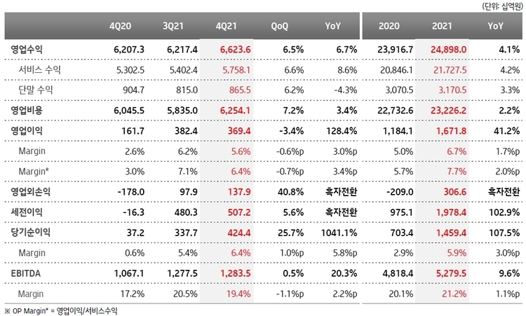 별도 기준 매출과 영업이익은 18조 3874억 원, 1조 682억 원으로 전년 대비 각각 2.8%와 21.6% 성장하며 당초 2022년 목표였던 별도 기준 영업이익 1조 원을 2021년에 조기 달성했다. 별도 기준 서비스 매출은 전년 대비 2.8% 증가한 15조 5041억 원을 기록하며 2020년 15조 원을 돌파한 이후 성장세가 더욱 확대되었다.