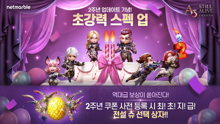 먼저, 사전등록에 참여한 이용자에게는 '전설 슈 선택 상자'를 얻는 2주년 쿠폰을 선물한다. 업데이트 이후 쿠폰을 사용하면 ▲전설 태고의 알 ▲전설 파텔라 ▲올체 ▲투스코 ▲이고아 ▲피지아 ▲유리스 중 1종을 선택해 보상을 획득할 수 있다.