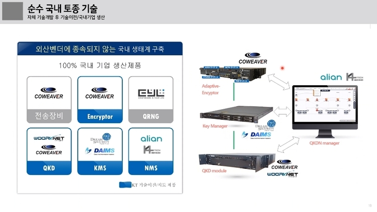 이 상무는 "하드웨어보다 네트워크를 어떻게 구성하느냐가 양자암호 통신 사업화의 핵심이다. 장비의 안정성과 네트워크가 끊어졌을 때 서비스가 그대로 이어지는 것, 장비의 전반적인 단가를 낮추는 것 등이 중요한 기술 요소"라며 "KT는 직접 부품을 사서 제작하고 하드웨어를 구성했다. 관련 기술을 국내 업체에 이관함으로써 순수 국내 기술로 생산하는 '에코 시스템'도 완성했다"고 설명했다.