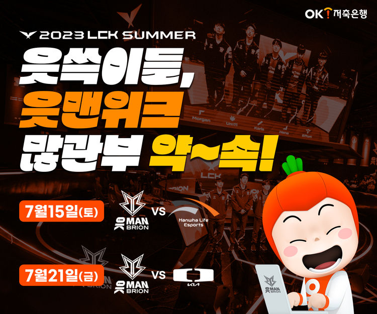 【 청년일보 】 OK저축은행은 네이밍 스폰서십을 체결한 리그오브레전드(LOL) 이스포츠팀 'OK저축은행 브리온'과 함께 오는 15일, 21일 양일간 브랜드 위크인 '읏맨 위크'를 진행한다고 13일 밝혔다.