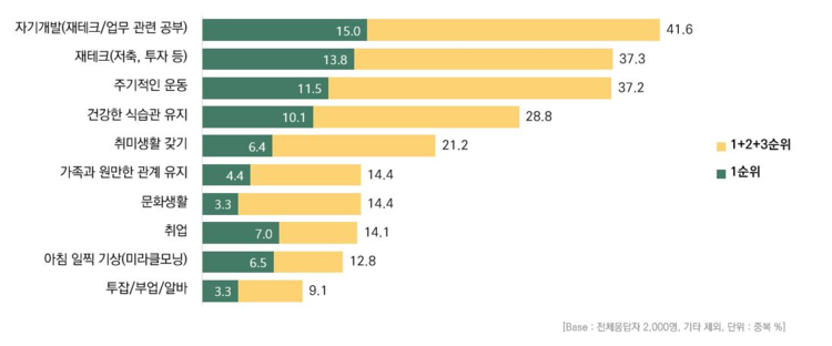 '갓생'을 위해 중요하다고 생각하는 요소로는 '자기개발'(41.6%), '재테크(37.3%)', '주기적인 운동(37.2%)', '건강한 식습관 유지(28.8%)' 등으로 조사됐다.