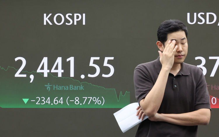 5일 한국거래소에 따르면 코스피 지수는 전 거래일보다 234.64포인트(8.77%) 내린 2,441.55로 거래를 마쳤다. 지수는 전장보다 79.44포인트(2.97%) 하락한 2,596.75로 개장 후 가파르게 낙폭을 키워 2,400선을 내줬다.