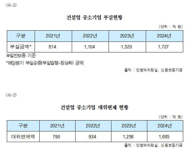 15일 국회 정무위원회 소속 더불어민주당 민병덕 국회의원이 신용보증기금에서 받은 자료에 따르면, 중소 건설업 부실금액은 2021년 814억원에서 2024년 1천727억원으로 3년 새 212% 급증했다.