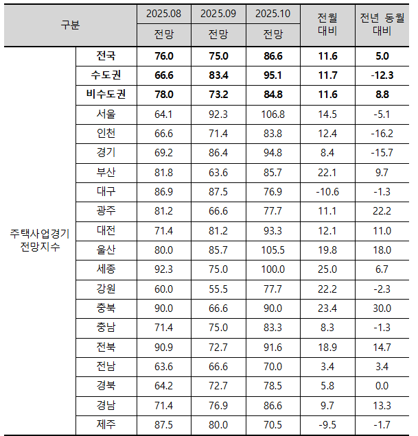 수도권은 11.7p 상승하며 95.1로, 비수도권은 11.6p 상승하며 84.8로 전망됐다.