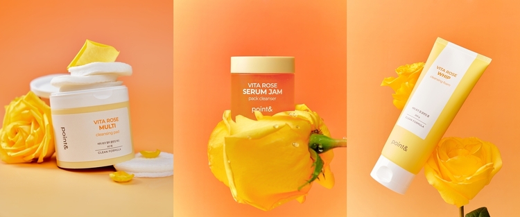 포인트앤 비타 로즈 라인은 세안 단계별로 선택해 사용할 수 있도록 비타 로즈 멀티 클렌징 패드, 비타 로즈 세럼잼 팩 클렌저, 비타 로즈 휩 클렌징 폼 등 3종으로 구성됐다.