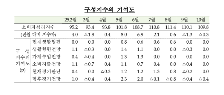 반면, 10월 소비자심리지수(CCSI)는 109.8로 9월(110.1)보다 0.3p 하락하며 두 달 연속 내림세를 보였다.