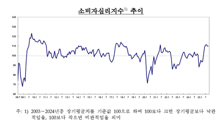 CCSI는 현재생활형편, 생활형편전망, 가계수입전망 등 6개 지수를 이용해 산출하며, 100보다 높으면 장기평균(2003∼2024년) 대비 소비 심리가 낙관적임을 뜻한다.