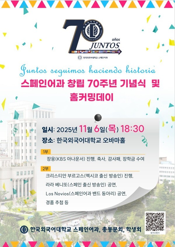 【 청년일보 】 한국외국어대학교 스페인어과가 6일 오후 6시 30분 서울캠퍼스 오바마홀에서 창립 70주년 기념식 및 홈커밍데이를 개최한다.