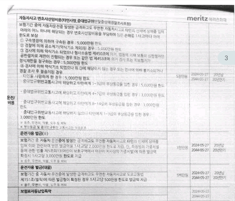 현재 대부분의 손해보험사들은 송사에 휘말렸을 경우 법률방어비용 지원 차원의 변호사선임비용을 비롯 형사합의금, 벌금 등을 특약 담보로 보장하고 있는 운전자보험을 판매하고 있다. 알려진 바에 따르면 현재 판매 중인 법률방어비용 특약 중 변호사선임비용은 5000만원 한도에서, 형사합의금을 최대 2억원까지 보장하고 있다.