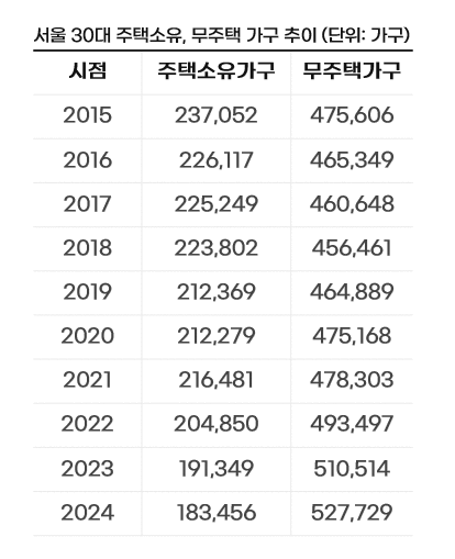 무주택 가구 수가 주택 소유 가구의 약 2.9배에 달하며 그 격차 또한 역대 가장 큰 수준으로 벌어졌다. 서울 30대 주택 소유 가구는 2023년 이미 20만 선이 붕괴된 바 있다.