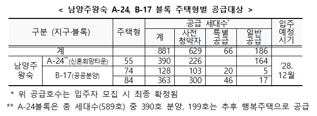【 청년일보 】 국토교통부와 한국토지주택공사(LH)가 3기 신도시인 남양주왕숙 지구 내 핵심 입지로 꼽히는 A-24블록과 B-17블록의 입주자 모집 공고를 진행한다고 27일 밝혔다.
