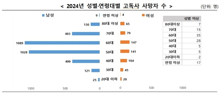 성별과 연령대를 종합적으로 분석해 보면 60대 남성 사망자(1천89명, 27.8%)가 가장 많았고, 50대 남성(1천28명, 26.2%)이 두 번째로 많아 중장년 남성이 고독사에 가장 취약한 것으로 분석됐다.