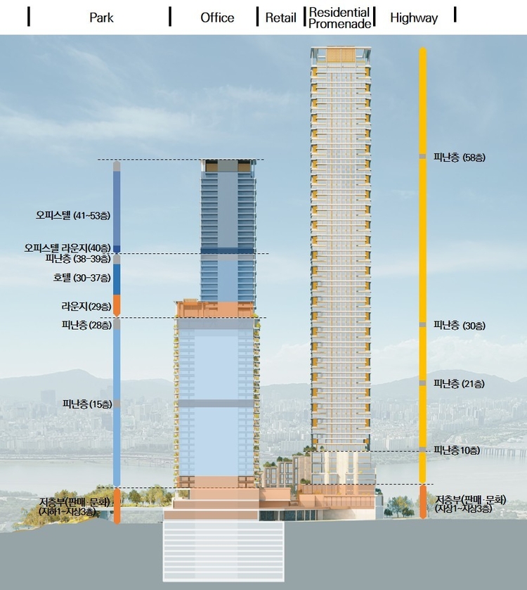 이번 계획안에는 서울숲과 사업지를 잇는 입체 보행 공원을 조성해 녹지 축을 확장하는 방안도 담겼다. 건물 내 조성되는 공유 공간은 시민들에게 상시 개방하여 도심 속 휴식처로 제공된다.
