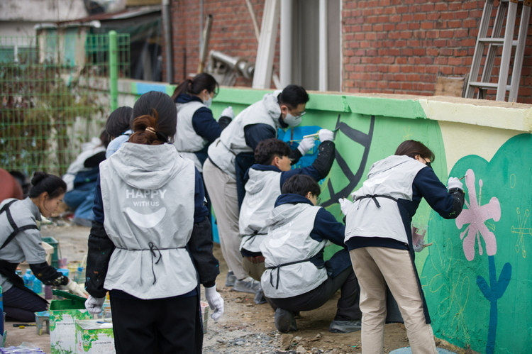 봉사자들은 벽면 정비와 밑작업, 채색 등 전 과정을 함께하며, 아이들이 오가며 마주하는 담벼락과 실외 활동 공간을 동화 속 숲과 자연을 주제로 한 밝고 따뜻한 벽화로 채워 넣었다.