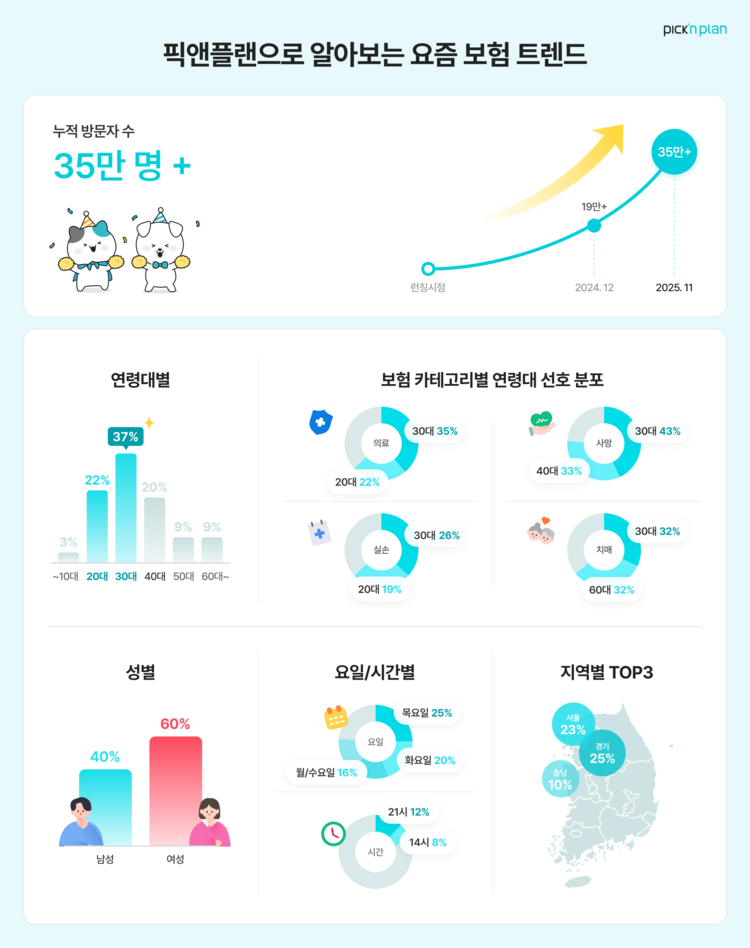 【 청년일보 】 프라임에셋은 최근 보험 비교 플랫폼 ‘픽앤플랜(Pick’n Plan)’의 누적 가입자 35만명을 돌파하며 이용자의 보험 상담 이용 흐름을 정리한 인포그래픽을 공개, 연령대별로 뚜렷하게 구분되는 보험 관심도를 확인할 수 있는 자료를 발표했다고 3일 밝혔다.