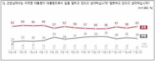 엠브레인퍼블릭·케이스탯리서치·코리아리서치·한국리서치가 지난 8∼10일 만 18세 이상 1천4명을 대상으로 진행해 이날 공개한 전국지표조사(NBS)에서 이 대통령의 국정운영을 긍정 평가한 응답자는 직전 조사인 2주 전보다 4%포인트(p) 오른 62%로 집계됐다.