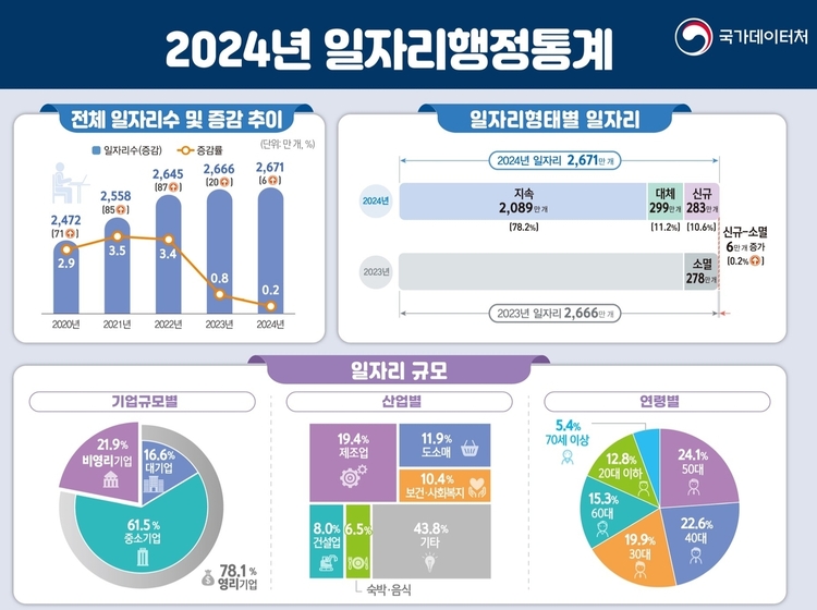 국가데이터처(옛 통계청)가 11일 발표한 '2024년 일자리행정통계 결과'를 보면 지난해 연간 일자리는 2천671만개로 전년에 비해 6만개(0.2%) 증가했다.