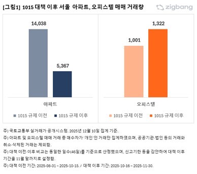 15일 부동산 플랫폼 직방에 따르면 10·15 대책 시행 전후 46일간의 매매거래량을 분석한 결과, 서울 아파트 거래량은 대책 이전(8월 31일∼10월 15일) 1만4천38건에서 대책 이후(10월 16일∼11월 30일) 5천367건으로 약 62% 급감했다.