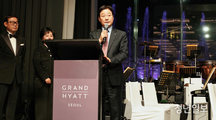'그랜드 하얏트 서울' 그랜드 볼룸에서 열린 '2025 서울팝스오케스트라 다문화가정돕기 디너 콘서트'에 앞서 후원회 부회장을 맡고 있는 소효근 컬리넌홀딩스 대표가 인사말을 전하고 있다.