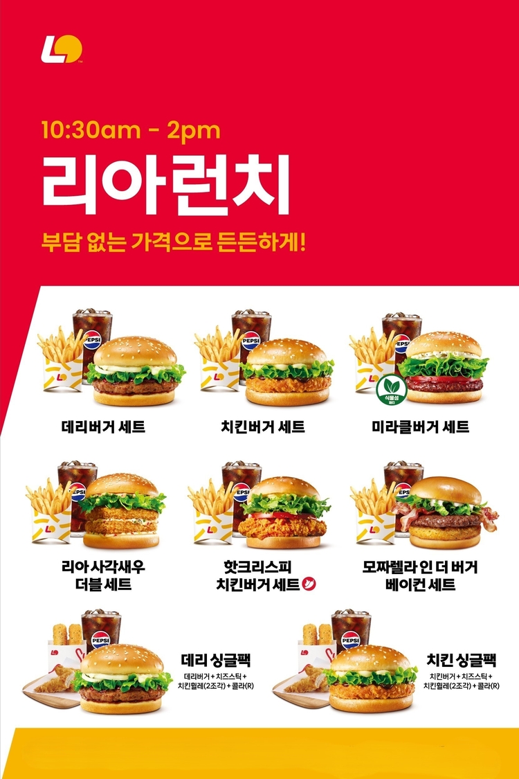 '리아런치' 메뉴는 데리버거, 치킨버거, 미라클버거, 리아 사각새우 더블, 핫크리스피치킨버거, 모짜렐라 인 더 버거 베이컨으로 구성된 버거 세트 6종과 데리버거와 치킨버거로 구성된 싱글팩 2종의 라인업으로 구성됐다.