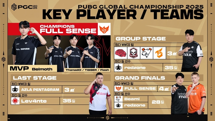 경기 결과, 올해 PGC 2025 우승은 태국의 풀센스(FULL SENSE)가 차지했다. 풀센스는 그랜드 파이널 초반부터 강력한 전투력과 안정적인 운영을 바탕으로 우승권을 빠르게 형성했으며, 경기 내내 꾸준한 기세를 이어가 최종 누적 포인트에서 큰 격차를 벌리며 정상에 올랐다.