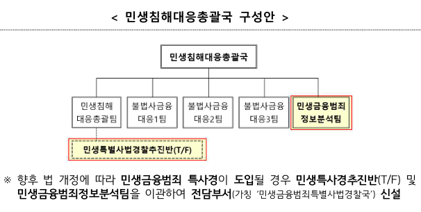 민생금융범죄 척결을 위한 조직 강화도 이번 개편의 주요 내용이다. 금감원은 불법사금융 등 민생범죄에 대한 실효적 대응을 위해 특별사법경찰 도입을 추진하고, 민생침해대응총괄국 내에 ‘민생특사경추진반(T/F)’과 ‘민생금융범죄정보분석팀’을 신설한다.