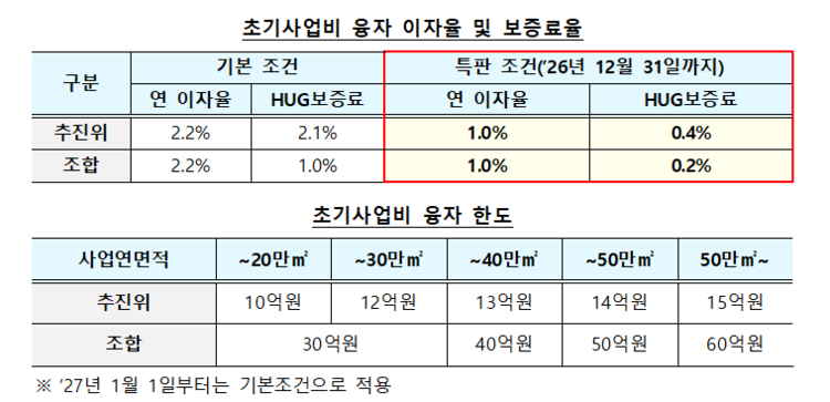 융자 한도는 사업장 규모(연면적)에 따라 차등 적용된다. 추진위원회는 10억원에서 최대 15억원까지, 조합은 30억원에서 최대 60억원까지 대출이 가능하다. 융자 기간은 1년이며, 2027년 1월 1일부터는 다시 기존 금리(연 2.2%)가 적용된다.