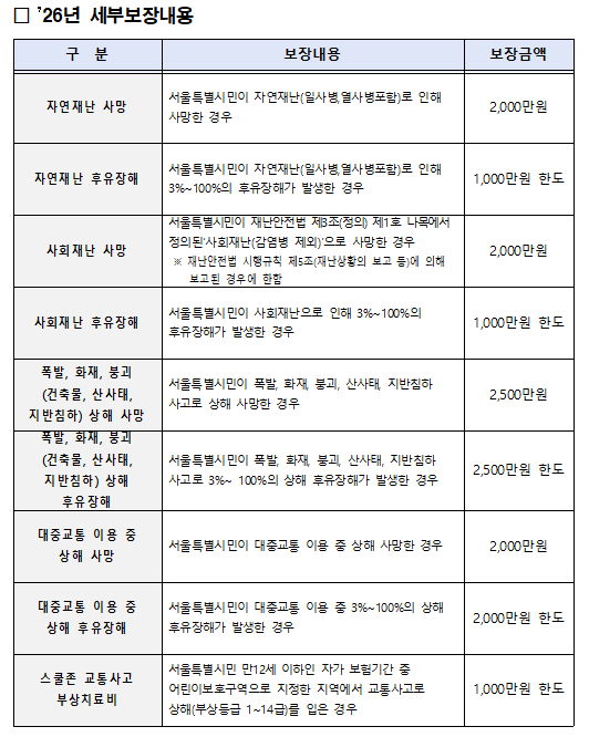 서울시는 예기치 못한 재난과 대형사고로 피해를 입은 시민과 유가족의 생계 안정을 지원하기 위해 1월 1일부터 '시민안전보험'을 강화해 운영한다고 9일 밝혔다.