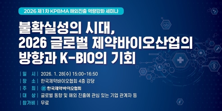 협회는 오는 1월 28일 오후 3시 한국제약바이오협회 4층 강당에서 ‘불확실성의 시대, 2026 글로벌 제약바이오산업의 방향과 K-BIO의 기회’ 세미나를 개최한다고 22일 밝혔다.