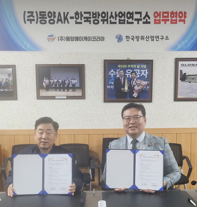 【 청년일보 】 한국방위산업연구소는 알루미늄 소재 전문 기업체 동양AK코리아와 23일 세종특별자치시 연동면 소재 동양AK 본사 회의실에서 상호 업무협약 양해각서(MOU)를 체결했다.