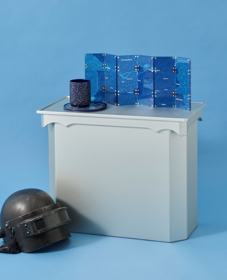 슈퍼포지션과의 협업에서는 배틀그라운드 게임 내 상징적인 공간인 '블루존'을 한국 전통 자개에서 착안한 '디지털 자개' 개념으로 재해석했다. 게임 속에서 긴장과 전략을 상징하는 블루존을 병풍이라는 전통 오브제로 구현해, 디지털 세계의 이미지를 오프라인 예술 작품으로 시각화했다. 주요 상품으로는 '펍지 블루존 병풍'과 '블루존 오브젝트 컵·접시 세트'가 있다.