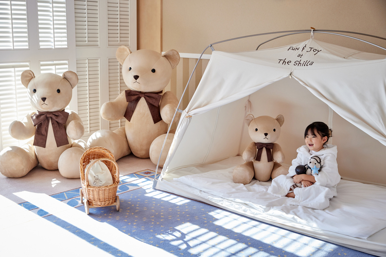 객실에는 아이들이 좋아하는 키즈 텐트를 설치하고, 소·중·대형 신라베어 인형과 신라베어 자수 쿠션, 신라베어 자수 키즈 배스로브 등 신라베어 테마 소품을 비치해 아이 눈높이에 맞춘 공간으로 완성했다.