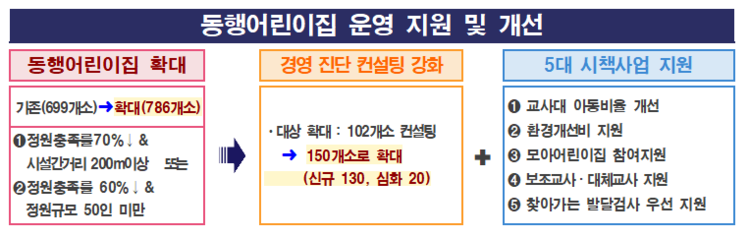 이와 함께 ▲교사 대 아동비율 개선 ▲환경개선비 지원 ▲서울형 모아어린이집 참여 가점 부여 ▲보조교사·대체교사 우선 지원 ▲찾아가는 발달검사 우선 지원 등 5대 시책사업 혜택을 제공한다.