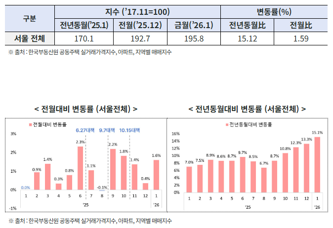 서울시가 18일 발표한 자료에 따르면 2026년 1월 서울 아파트 매매 실거래가격지수는 전월 대비 1.59% 올랐다.